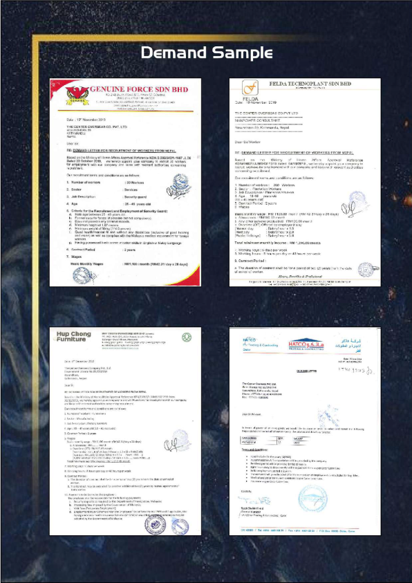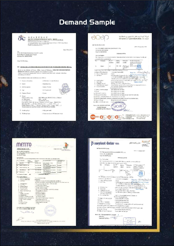 In order to facilitate the recruitment of Nepalese manpower, foreign employers are required to engage licensed agencies that are officially registered under the Department of Labor in Nepal. These authorized agencies serve as intermediaries between foreign employers and potential Nepalese employees. Once a foreign employer provides an authenticated demand for manpower to one of these licensed agencies, the agency, such as The Center Overseas, initiates the recruitment process. This entails applying to the Director General of the Labor Department, the primary governmental authority responsible for overseeing and regulating the activities of recruitment agencies in Nepal. The Labor Department plays a pivotal role in supervising and monitoring the recruitment process, ensuring it aligns with established regulations and standards. It is also responsible for granting permission for the placement of the recruited manpower. To secure this permission, The Center Overseas, like other recruitment agencies, must submit a comprehensive set of authenticated documents to the Labor Department for their evaluation and approval. This meticulous process ensures that all recruitment activities adhere to legal requirements and promote fairness and transparency in the hiring of Nepalese workers for overseas employment.